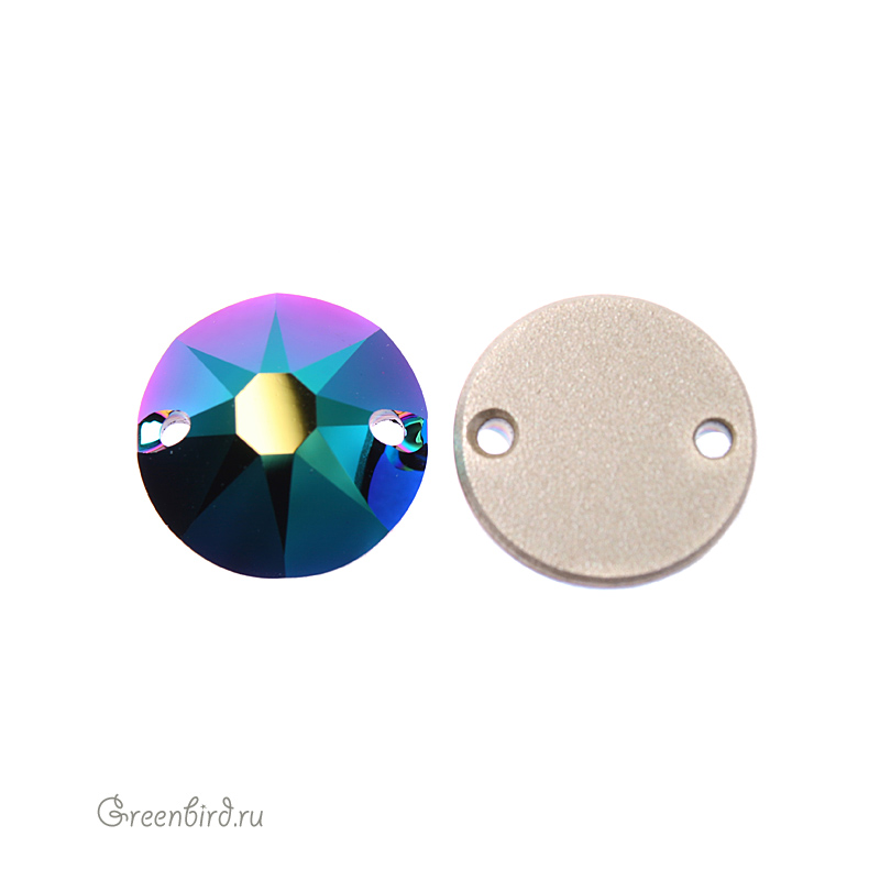 Swarovski 3288 Sew-on Stone – пришивные стразы круглой формы с двумя отверстиями. Размер: 12 мм, отверстие: 0,8 мм. Цвет: прозрачный с эффектом "Зеленый скарабей" / Crystal Scarabaeus Green Foiled (#001SCGR). Производство: Австрия. Цена указана за 1 шт.