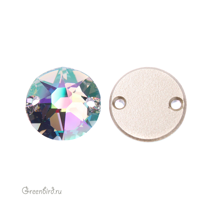 Swarovski 3288 Sew-on Stone – пришивные стразы круглой формы с двумя отверстиями. Размер: 12 мм, отверстие: 0,8 мм. Цвет: прозрачный с эффектом "Райское сияние" с фольгированием / Crystal Paradise Shine Foiled (#001PARSH). Производство: Австрия. Цена указана за 1 шт.