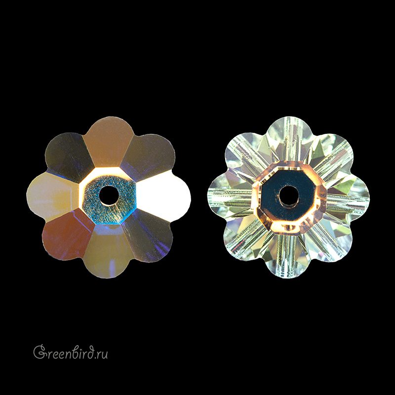 Swarovski 3700 Marguerite Lochrose Sew-on Stone – пришивные стразы в форме цветка с одним отверстием. Размер: 12 мм, отверстие: 1 мм. Цвет: прозрачный с радужным эффектом с фольгированием / Crystal Aurore Boreale Foiled (#001AB). Производство: Австрия. Цена указана за 1 шт.