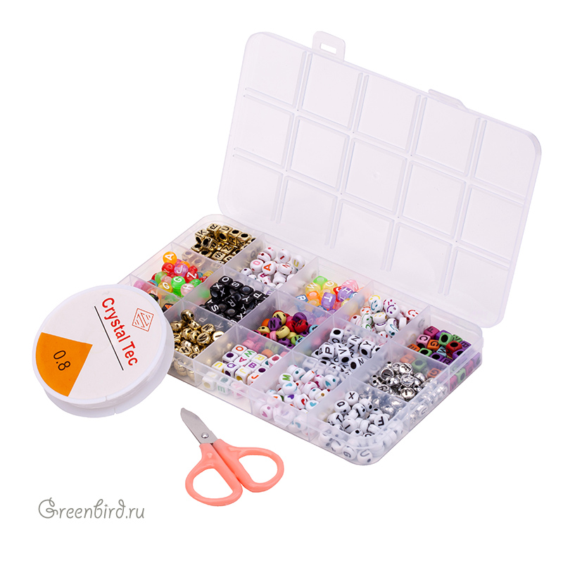 - 15 видов разнообразных бусин (буквы, цифры, смайлики, сердечки);