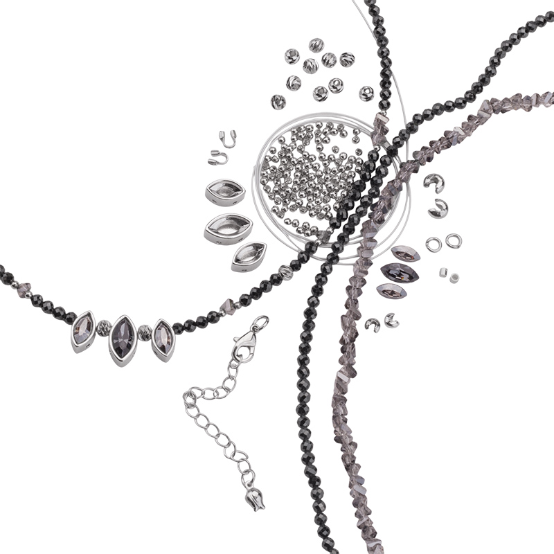 В комплект входят соединительные кольца, протекторы, кримпы, бусины на кримп в двух размерах, а также прочный ювелирный тросик SakuLux, замок-лобстер, микс бусин, кристаллы и оправы.