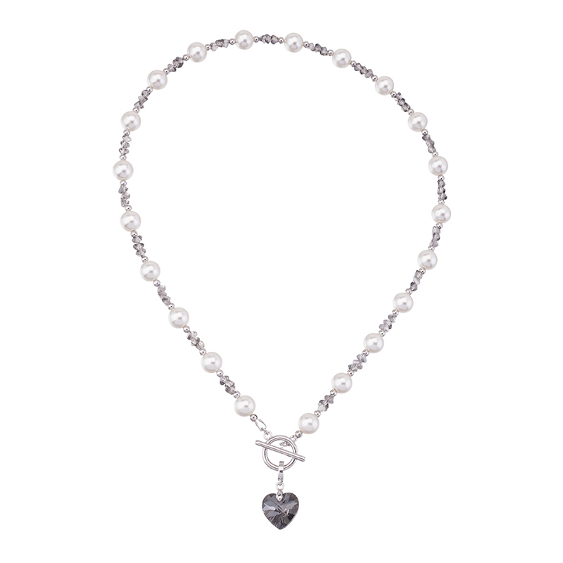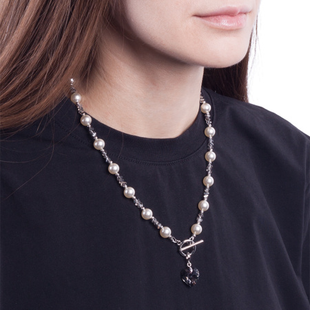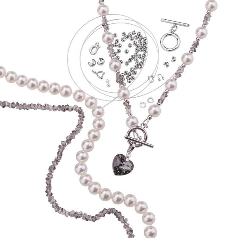 В комплект входят все необходимые компоненты: прочный ювелирный тросик SakuLux, надёжный замок-лобстер, соединительные кольца, протекторы, кримпы и бусины на кримп в двух размерах. Основу дизайна составляют кремовый круглый жемчуг Crystalbird, гранёные бусины-крошка цвета Black Diamond и металлический бисер. Особый шарм украшению придадут подвеска Crystalbird «Сердце» на бейле-замочке и классический замок-тоггл.