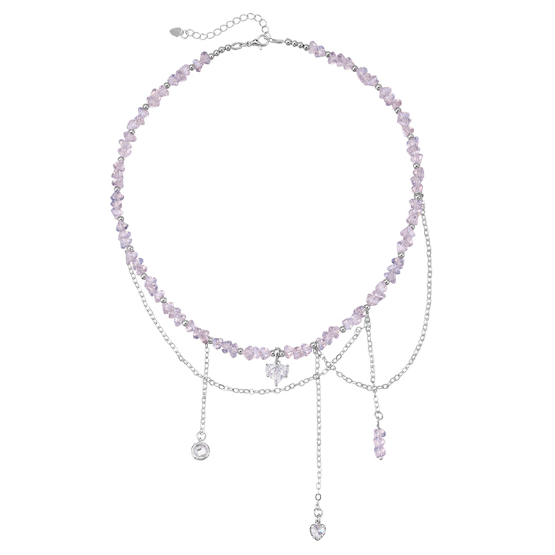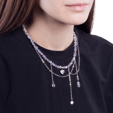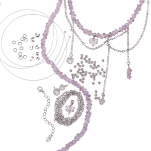 В комплект входят соединительные кольца, протекторы, кримпы, бусины на кримп в двух размерах, а также прочный ювелирный тросик SakuLux. Основу дизайна составляют гранёные бусины-крошка светло-сиреневого цвета, металлический бисер, стильная цепочка и три изысканные подвески с фианитами. Завершает композицию надежный замок-лобстер в форме сердечка с удлинителем.