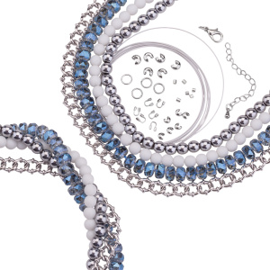 В комплект входят соединительные кольца, протекторы, кримпы, бусины на кримп разных размеров, а также прочный ювелирный тросик SakuLux и надежный замок-лобстер с удлинителем. Основу дизайна составляют круглые матовые бусины, металлические бусины «геметин» цвета никель, граненые рондели Black Diamond и выразительная фигурная цепочка.