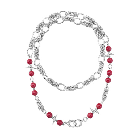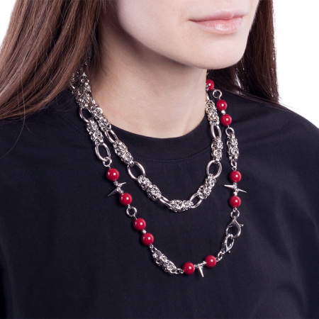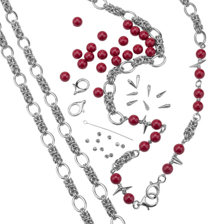 Набор материалов для сборки колье-обвеса включает тщательно подобранные материалы и качественную фурнитуру, которые позволят собрать уникальное украшение своими руками. Создайте дерзкое и эффектное колье-трансформер, сочетающее брутальный стиль цепей и шипов с контрастным акцентом красного жемчуга.