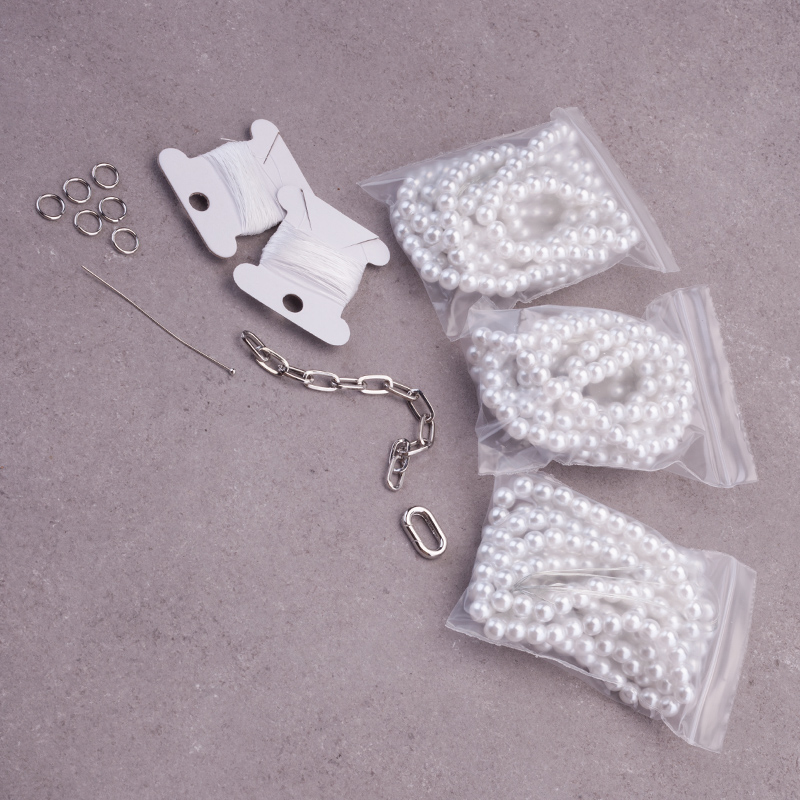 В набор входят все необходимые материалы: жемчуг в нужном количестве (в этом наборе жемчуг 6 мм в оттенке White, прочная нить для бисероплетения, тонкие иглы, а также полный комплект фурнитуры - соединительные колечки, цепочка для удлинителя и надежный замок-карабин. Все, что нужно для готового аксессуара, уже внутри.