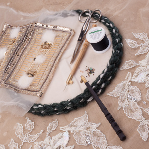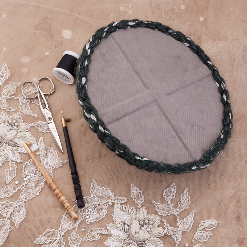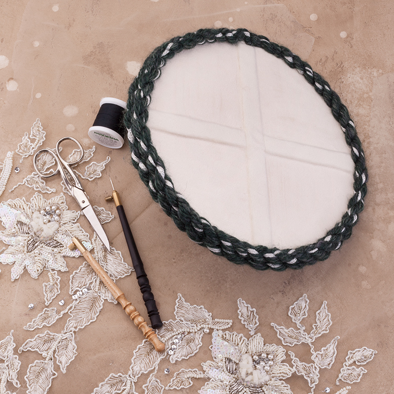 В комплект входят все необходимые материалы: деревянная заготовка диаметром 20 см, плотный фетр, итальянский велюр двух оттенков (бежевый и серо-зеленый), текстильный клей Fevicryl, швейные нитки Madeira Aerofil №120, а также эксклюзивный декоративный шнур из пряжи, созданный специально для этого проекта командой Greenbird.ru.