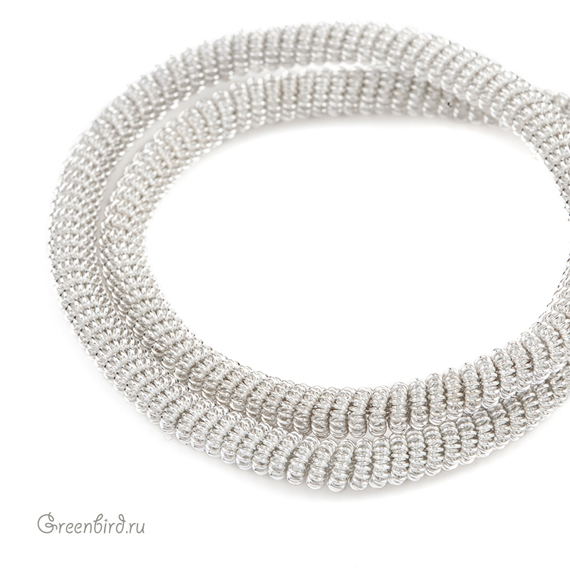 Канитель витая — металлическая нить для вышивания (медь), представляет собой пружинку, закрученную в спираль. Диаметр: 4 мм, цвет: серебро. Производство: Индия. Цена указана за 5 грамм (примерно 23 см). Из-за особенностей материала непрерывность нити в упаковке не гарантируется, вы получите несколько отрезков разной длины.