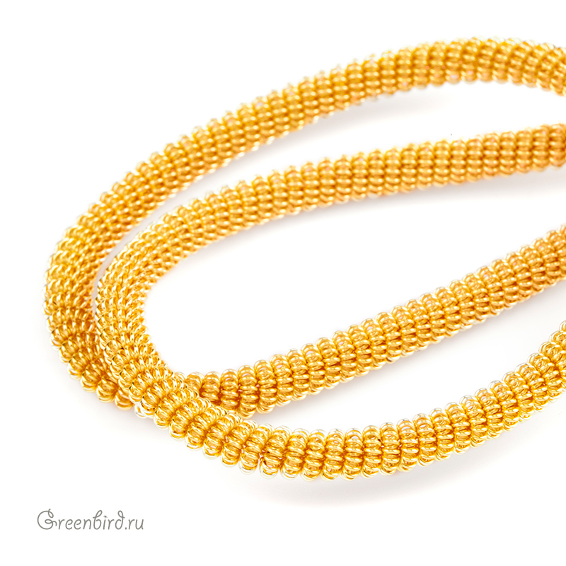 Канитель витая — металлическая нить для вышивания (медь), представляет собой пружинку, закрученную в спираль. Диаметр: 4 мм, цвет: золото. Производство: Индия. Цена указана за 5 грамм (примерно 23 см). Из-за особенностей материала непрерывность нити в упаковке не гарантируется, вы получите несколько отрезков разной длины.
