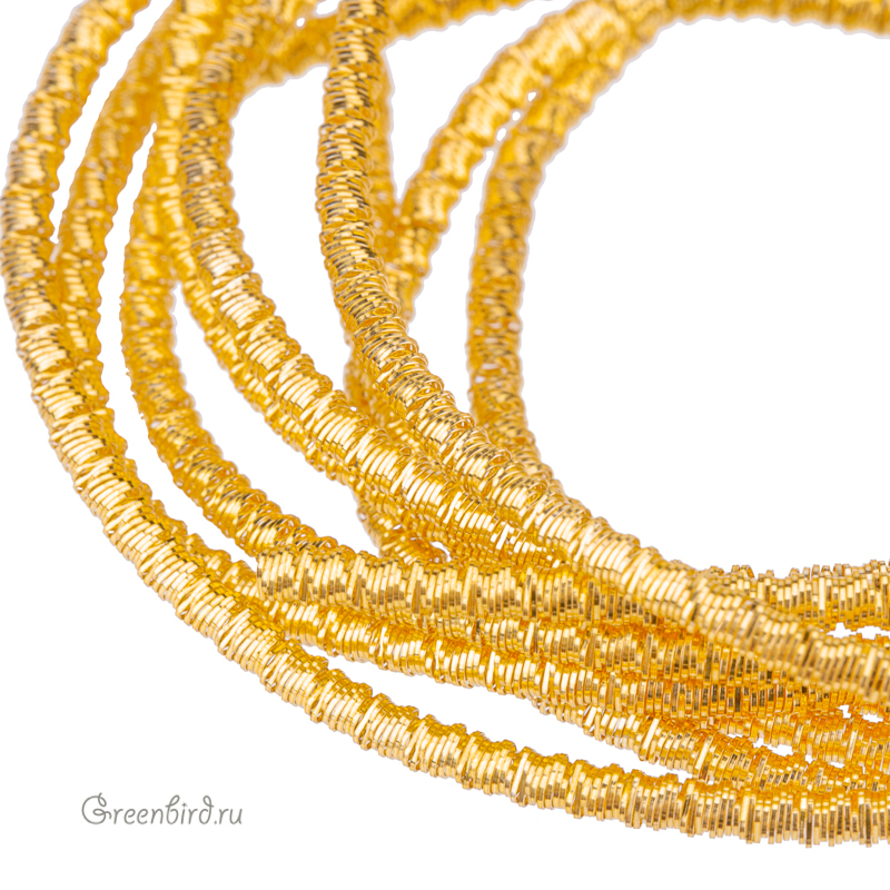 Канитель фигурная "Волна" — металлическая нить для вышивания (медь), закрученная в спираль с двойным паттерном. Диаметр: 1,8 мм, цвет: желтое золото. Производство: Индия. Цена указана за 5 грамм (примерно 1,4 метра). Из-за особенностей материала непрерывность нити в упаковке не гарантируется, вы получите несколько отрезков разной длины.