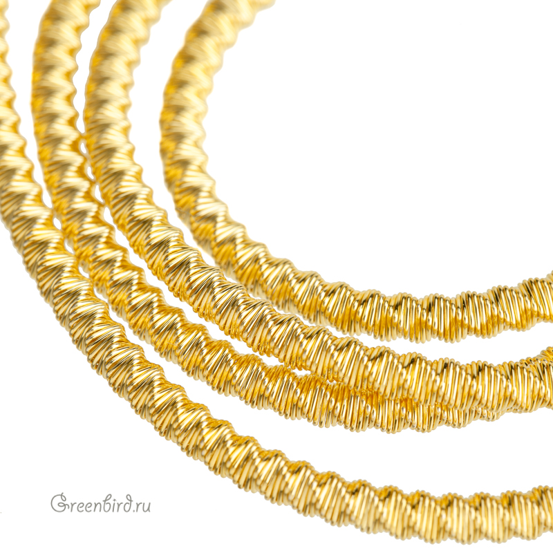 Канитель фигурная "зигзаг" — металлическая нить для вышивания (медь), закрученная в спираль. Диаметр: 2,5 мм, цвет: яркое золото. Производство: Индия. Цена указана за 5 грамм (примерно 40 см). Из-за особенностей материала непрерывность нити в упаковке не гарантируется, вы получите несколько отрезков разной длины.