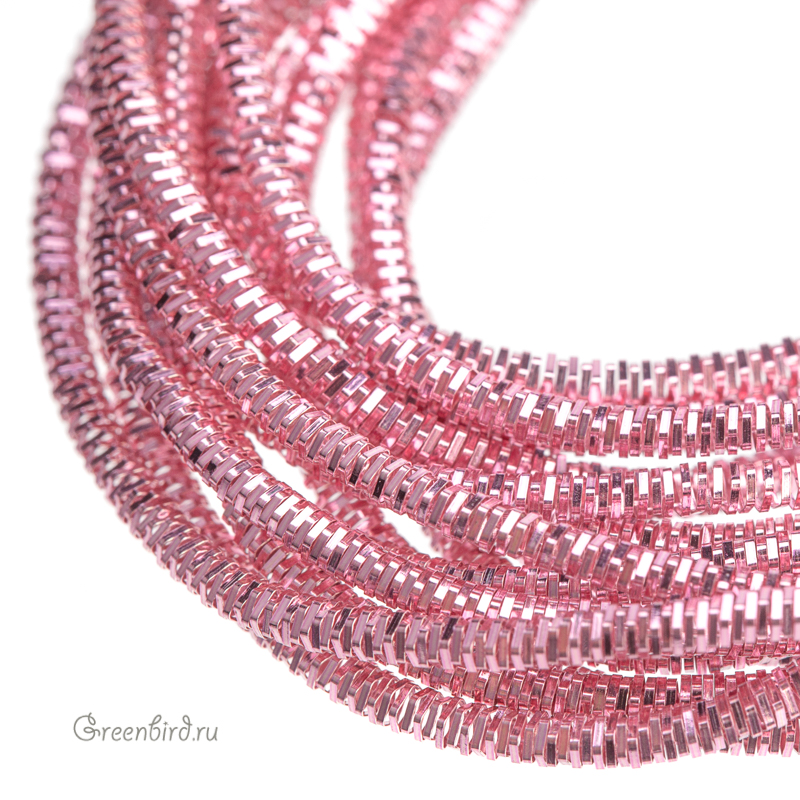 Канитель трунцал — металлическая граненая нить для вышивания из проволоки плоского сечения (медь), закрученная в спираль пятиугольной формы. Диаметр: 1,6 мм, цвет: розовый металлик. Производство: Индия. Цена указана за 5 грамм (примерно 2,4 метра). Из-за особенностей материала непрерывность нити в упаковке не гарантируется, вы получите несколько отрезков разной длины.