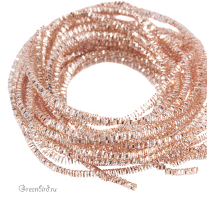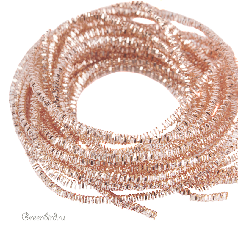 Канитель трунцал — металлическая граненая нить для вышивания из проволоки плоского сечения (медь), закрученная в спираль пятиугольной формы. Диаметр: 1,6 мм, цвет: розовое золото. Производство: Индия. Цена указана за 5 грамм (примерно 2,5 метра). Из-за особенностей материала непрерывность нити в упаковке не гарантируется, вы получите несколько отрезков разной длины.
