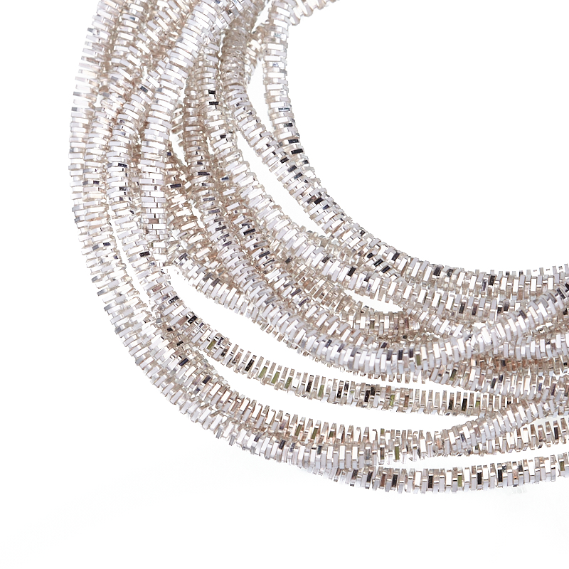 Канитель трунцал — металлическая граненая нить для вышивания из проволоки плоского сечения (медь), закрученная в спираль пятиугольной формы. Диаметр: 1,7 мм, цвет: серебро. Производство: Индия. Цена указана за 5 грамм (примерно 1,9 метра). Из-за особенностей материала непрерывность нити в упаковке не гарантируется, вы получите несколько отрезков разной длины.