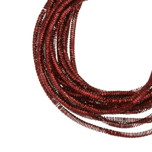 Канитель трунцал — металлическая граненая нить для вышивания из проволоки плоского сечения (медь), закрученная в спираль пятиугольной формы. Диаметр: 1,5 мм, цвет: темно-красный. Производство: Индия. Цена указана за 5 грамм (примерно 2,5 метра).Обратите внимание: канитель этого цвета более хрупкая и имеет меньшую плотность кручения (визуально сильнее растянута). Возможно наличие заломов и значительных растяжений. Из-за особенностей материала непрерывность нити в упаковке не гарантируется, вы получите несколько отрезков разной длины.
