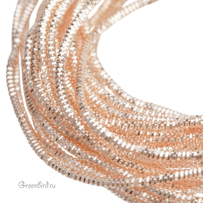 Канитель трунцал — металлическая граненая нить для вышивания из проволоки плоского сечения (медь), закрученная в спираль пятиугольной формы. Диаметр: 1,2 мм, цвет: розовое золото. Производство: Индия. Цена указана за 5 грамм (примерно 3,5 метра). Из-за особенностей материала непрерывность нити в упаковке не гарантируется, вы получите несколько отрезков разной длины.