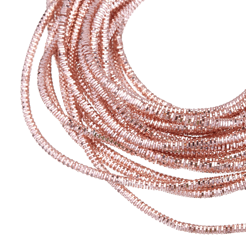 Канитель трунцал — металлическая граненая нить для вышивания из проволоки плоского сечения (медь), закрученная в спираль пятиугольной формы. Диаметр: 1,2 мм, цвет: розовое золото. Производство: Индия. Цена указана за 5 грамм (примерно 3,5 метра). Из-за особенностей материала непрерывность нити в упаковке не гарантируется, вы получите несколько отрезков разной длины.