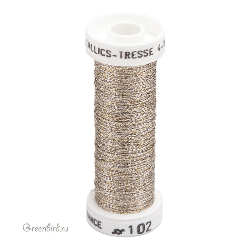 Металлизированная нить Au Ver à Soie Métallisé Tressé #4 для вышивки и ручной работы. Цвет: #102 (меланж, золото/серебро). Состав: 35% полиэстер, 65% купро (тонкая шелковая вискоза). Производство: Франция. Цена указана за 1 шт. (10 метров).