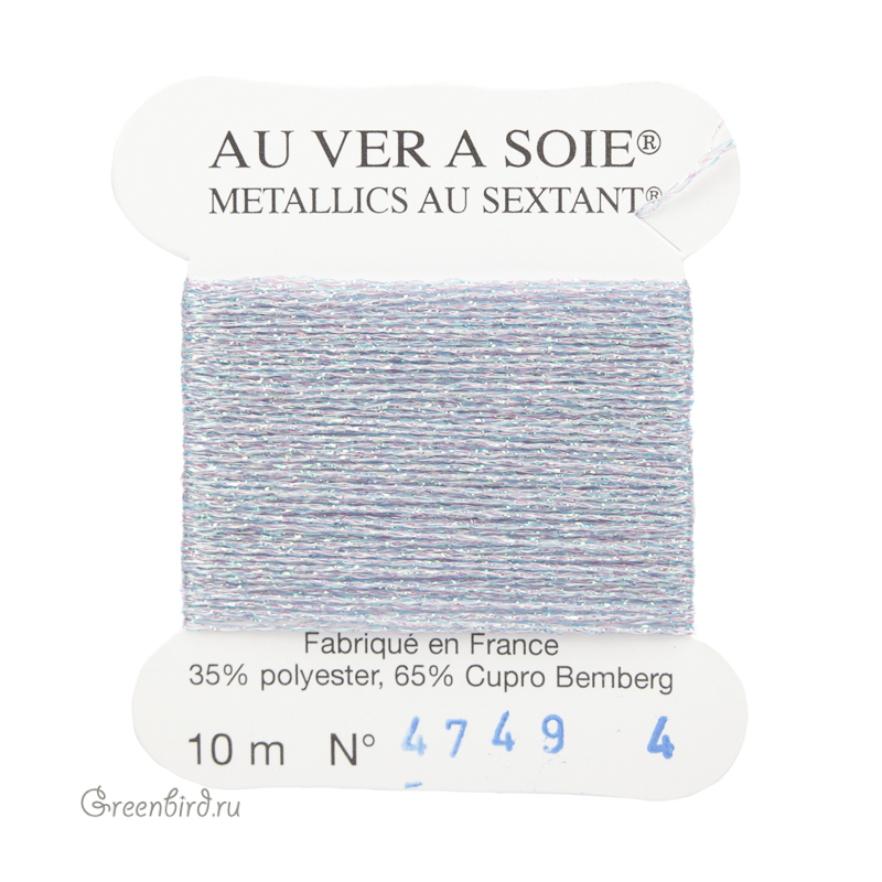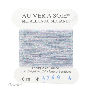 Металлизированная нить Au Ver à Soie Métallisé Tressé #4 для вышивки и ручной работы. Цвет: #4749 (меланж, бледный серо-голубой с радужным эффектом / сиреневый). Состав: 35% полиэстер, 65% купро (тонкая шелковая вискоза). Производство: Франция. Цена указана за 1 шт. (10 метров).