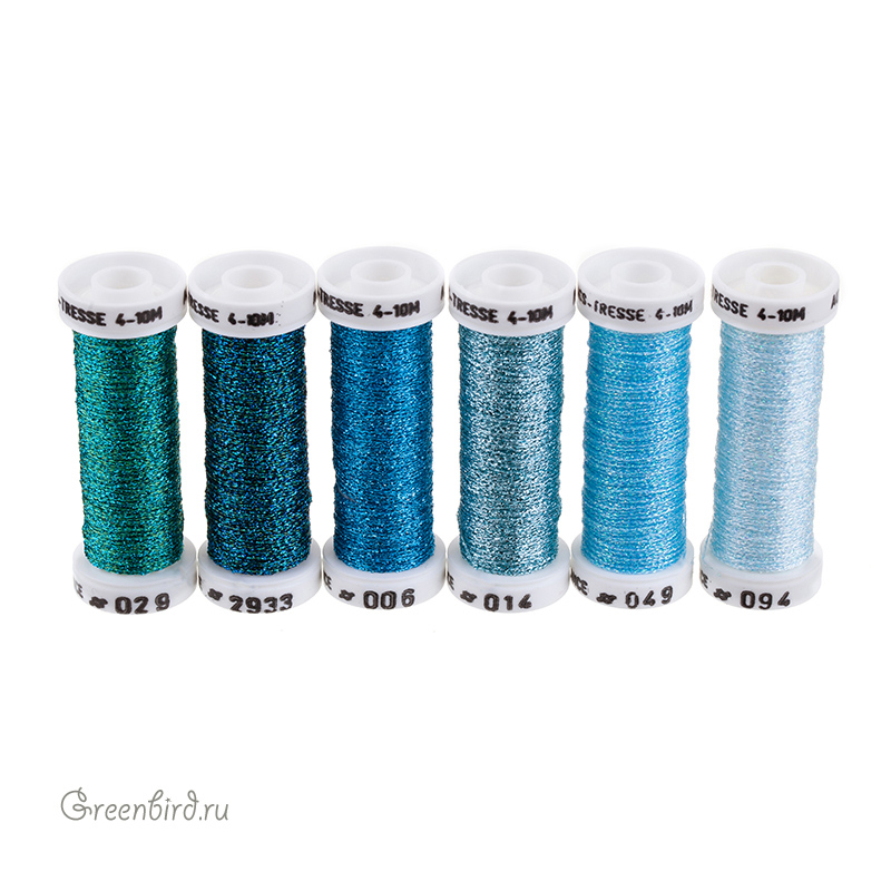 Набор металлизированных нитей Au Ver à Soie Metallise Tresse #4 6 Nuances (6 Shades) для вышивки и ручной работы. Нити Metallise Tresse представляют собой тонкий плетеный шнур и благодаря своей структуре не раскручиваются во время работы. Подходят для ручного вязания. Цвет: Blue (микс разных оттенков голубого), оттенки: #029 (морская волна), #2933 (бирюзово-синий), #006 (ярко-синий), #014 (серебристо-голубой), #049 (голубой), #094 (нежно-голубой). Состав: 35% полиэстер, 65% купро (тонкая шелковая вискоза). Производство: Франция. Цена указана за один набор (6 катушек по 10 м).