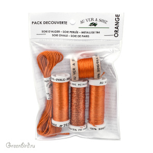 Набор ниток Au Ver à Soie для вышивки и декорирования. В набор входит: шелковое мулине Soie D'Alger® 1 шт. (5 метров), крученая шелковая нить Soie Perleé® 1 шт. (16 м), тонкая металлизированная нить Metallise Tresse 4 1 шт. (10 м), гладкая слабо крученная вышивальная нить Soie Ovale 1 шт. (30 м) и объемная вышивальная нить Soie de Paris® 1 шт. (5 м). Цвет: Orange (оранжевый). Состав: 100% шелк, металлизированная нить: 35% полиэстер, 65% купро (тонкая шелковая вискоза). Производство: Франция. Цена указана за один набор.