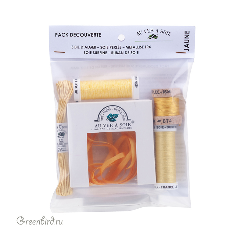 Набор ниток с шелковой лентой Au Ver à Soie для вышивки и декорирования. В набор входит: шелковое мулине Soie D'Alger® 1 шт. (5 метров), крученая шелковая нить Soie Perleé® 1 шт. (16 м), тонкая металлизированная нить Metallise Tresse 4 1 шт. (10 м), тонкая вышивальная нить Soie Surfine 1 шт. (100 м) и шелковая лента 4 мм (3 м). Цвет: Jaune-2 (желтый, лента желто-оранжевая). Состав: 100% шелк, металлизированная нить: 35% полиэстер, 65% купро (тонкая шелковая вискоза). Производство: Франция. Цена указана за один набор.