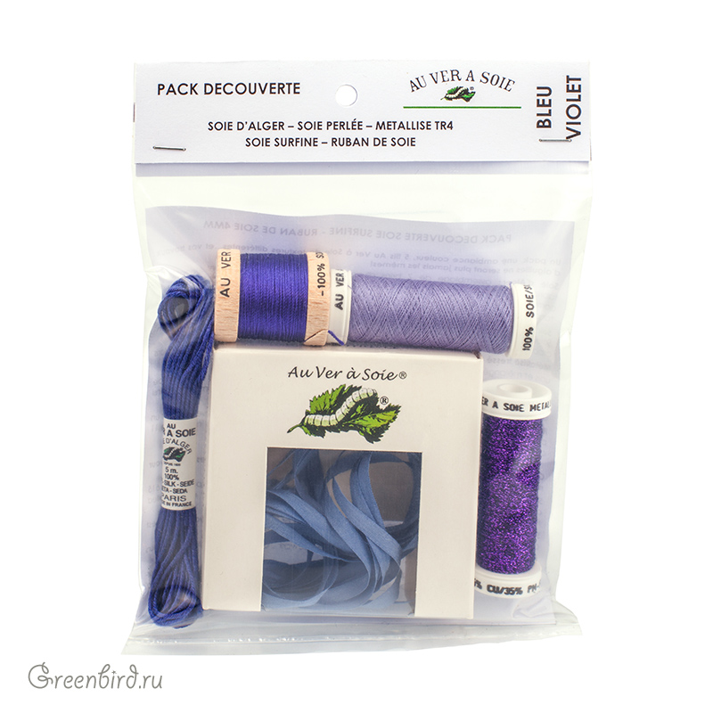 Набор ниток с шелковой лентой Au Ver à Soie для вышивки и декорирования. В набор входит: шелковое мулине Soie D'Alger® 1 шт. (5 метров), крученая шелковая нить Soie Perleé® 1 шт. (16 м), тонкая металлизированная нить Metallise Tresse 4 1 шт. (10 м), тонкая вышивальная нить Soie Surfine 1 шт. (100 м) и шелковая лента 4 мм (3 м). Цвет: Bleu Violet (сиреневый). Состав: 100% шелк, металлизированная нить: 35% полиэстер, 65% купро (тонкая шелковая вискоза). Производство: Франция. Цена указана за один набор.