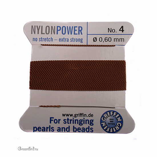 Нейлоновая нить с иглой для низания жемчуга Griffin, размер: 0,6 мм, цвет: темно-коричневый. Цена указана за упаковку (нить 2 метра, игла).