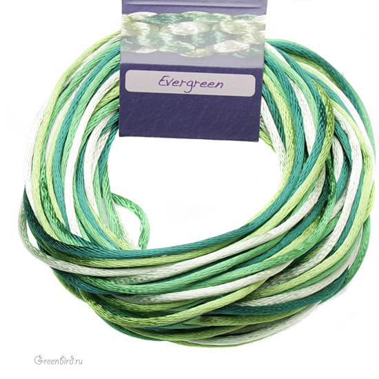 Сатиновый шнур для работы в японской технике кумихимо. Толщина: 2 мм, длина: 3 ярда (около 2,7 метров). Цвет: Микс Evergreen (мята, темно-зеленый, зеленое яблоко, изумруд). Производство: США. Цена указана за упаковку (4 шнура).