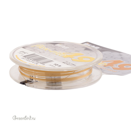 Ювелирный тросик Flex-Rite 49 (49 стальных струн) с нейлоновым покрытием. Диаметр: 0,35 мм (0,014"), дополнительное покрытие: золото 24 карат (24Kt Gold Plate), цвет: античное золото. Выдерживает вес до 6,5 кг. Производство: Япония. Цена указана за 1 катушку 10 футов (3,05 м).