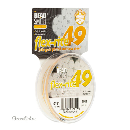 Ювелирный тросик Flex-Rite 49 (49 стальных струн) с нейлоновым покрытием. Диаметр: 0,45 мм, дополнительное покрытие: золото 24 карат (24Kt Gold Plate), цвет: античное золото. Выдерживает вес до 10,8 кг. Производство: Япония. Цена указана за 1 катушку 10 футов (3,05 м).