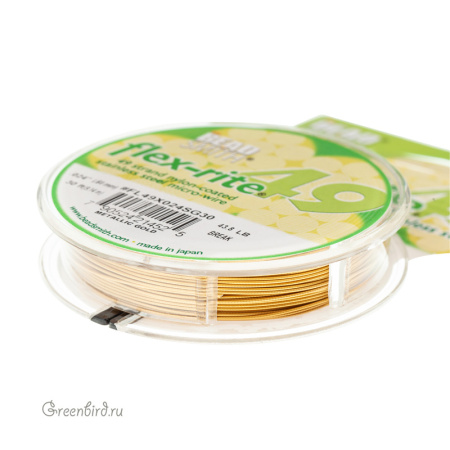 Ювелирный тросик Flex-Rite 49 (49 стальных струн) толстый с нейлоновым покрытием. Диаметр: 0,6 мм, цвет: матовое золото (металлик/сатин). Выдерживает вес до 19,8 кг. Производство: Япония. Цена указана за 1 катушку 30 футов (9,14 м).