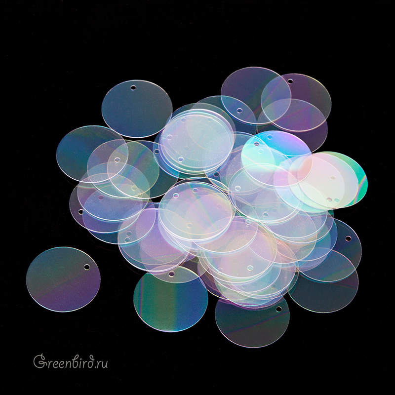 Пайетки плоские Motivo M66 со смещенным отверстием (100% полиэстер), используются в декоративной вышивке. Цвет: прозрачный, радужный, эффект: Irise Trasparenti, размер: 16 мм. Производство: Италия. Цена указана за 3 грамма (примерно 59 штук).