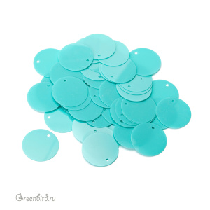 Пайетки плоские Motivo M66 со смещенным отверстием (100% полиэстер), используются в декоративной вышивке. Цвет: бирюза, эффект Opaline, размер: 16 мм. Производство: Италия. Цена указана за 3 грамма (примерно 59 штук).