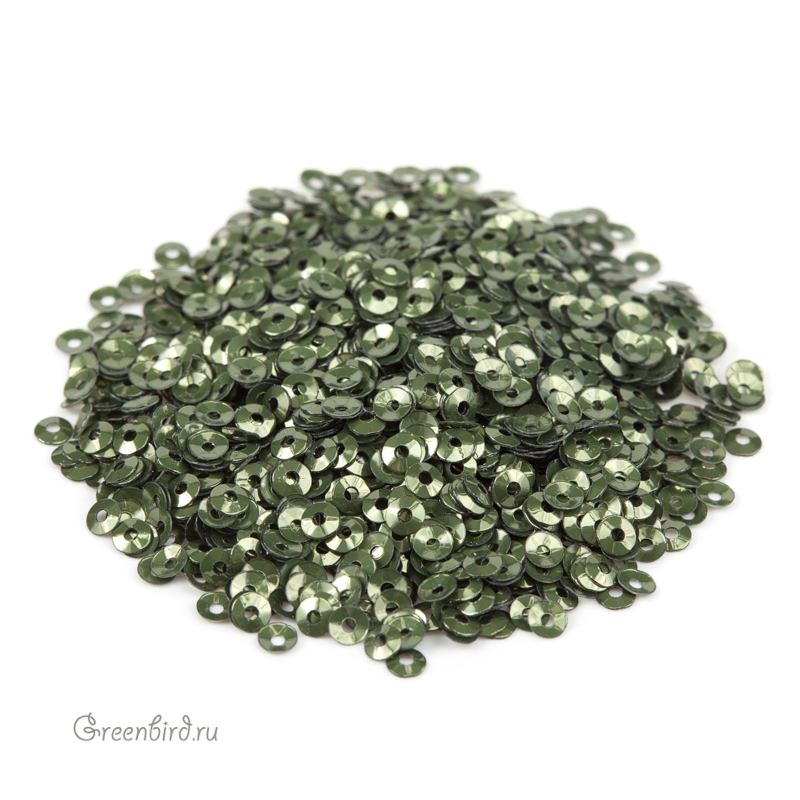 Пайетки чаша (100% полиэстер), используются в декоративной вышивке. Цвет: зеленый шалфей, эффект: Metal, размер: 3 мм. Производство: Италия. Цена указана за 3 грамма (примерно 1700 штук).