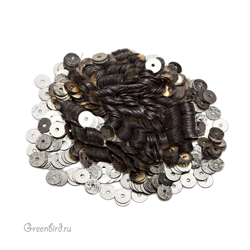 Пайетки плоские (100% полиэстер), используются в декоративной вышивке. Цвет: старинное серебро, эффект Métallique, размер: 4 мм. Производство: Франция. Цена указана за нить 1000 штук (примерно 2,8 грамма).