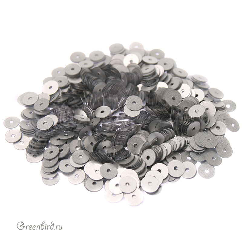 Пайетки плоские (100% полиэстер), используются в декоративной вышивке. Цвет: матовое серебро, размер: 4 мм. Производство: Франция. Цена указана за нить 1000 штук (примерно 2,8 грамма).