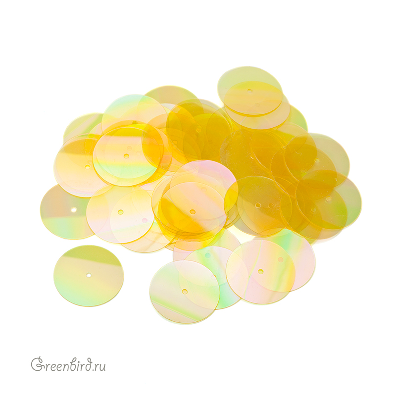 Пайетки плоские (100% полиэстер), используются в декоративной вышивке. Цвет: желтый радужный, эффект: Irise, размер: 16 мм. Производство: Италия. Цена указана за 3 грамма (примерно 58 штук).