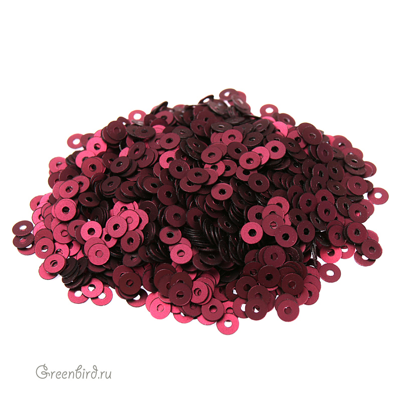 Пайетки плоские (100% полиэстер), используются в декоративной вышивке. Цвет: бордо, эффект: Satinanti MT, размер: 3 мм. Уход: стирать при температуре 30°, не отбеливать, гладить на единичке (120°), не сушить в барабане машинки, сухая чистка ℗. Производство: Италия. Цена указана за 3 грамма (примерно 1800 штук).