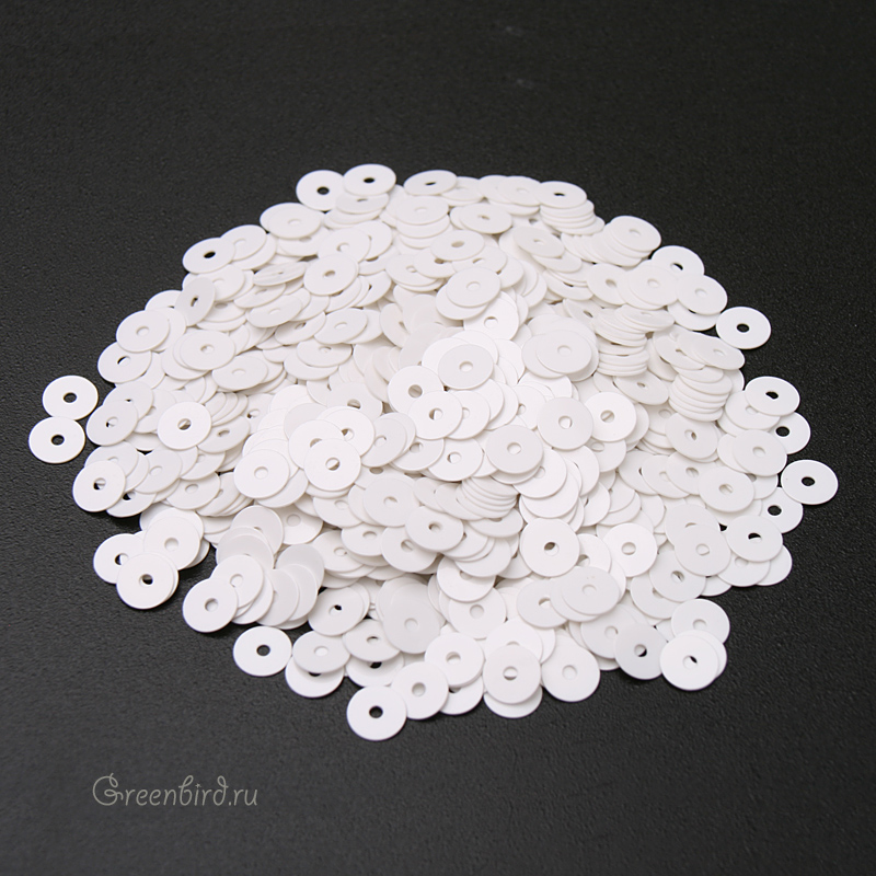Пайетки плоские (100% полиэстер), используются в декоративной вышивке. Цвет: белый лед, эффект: Opaline, размер: 4 мм. Уход: бережная стирка 30°, не отбеливать, гладить на единичке (120°), не сушить в барабане машинки, сухая чистка ℗. Производство: Италия. Цена указана за 3 грамма (примерно 1000 штук).